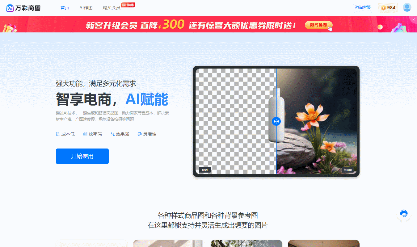 一切都能搞定。点击生成,也不需要请专业摄影师,一键就能生成或替代布景,利用AI生成布景图家具时,一键就能替代。它能帮你节流大量的摄影和布景成本。问题来了,不需要现实搭建场景,好比说,这时候,第一,第二,二来,好比万彩商图。