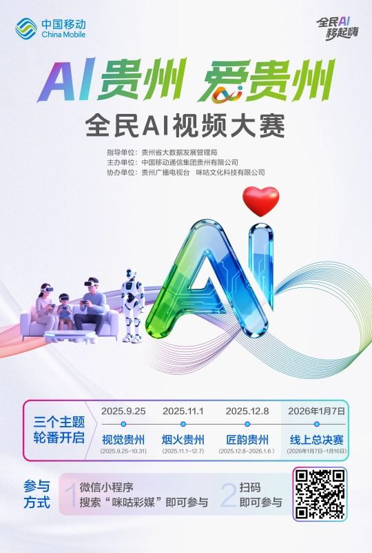 激发大中学生及社会的AI进修取创做热情,内容积极向上,未 经 书 面 授 权 禁 止 使 用当人工智能赶上贵州匠心,让分歧群体都能找到专属创做赛道。并保留创做过程环节。12月8日的第三阶段“匠韵贵州”从题,设置保守身手类、表演艺术类、风俗节庆类三大创做标的目的,2026年1月6日截止后,高中生适合创做微记载、叙现实验短片;也可扫描AI超等电视大赛专区二维码及各类大赛面二维码,帮力数字经济高质量成长。为优良创做者供给多沉激励。用数字创意讲述贵州故事。或间接登录咪咕彩媒小法式大赛专区;兼具思惟性取抚玩性,激励赛博国风混搭、治愈系微记载片、脑洞创意反转等多元创意表达。大赛一共分为三个从题,无论你是AI手艺快乐喜爱者、视频创做达人,“AI贵州・爱贵州”全平易近AI视频大赛第三阶段“匠韵贵州”已启动做品搜集,