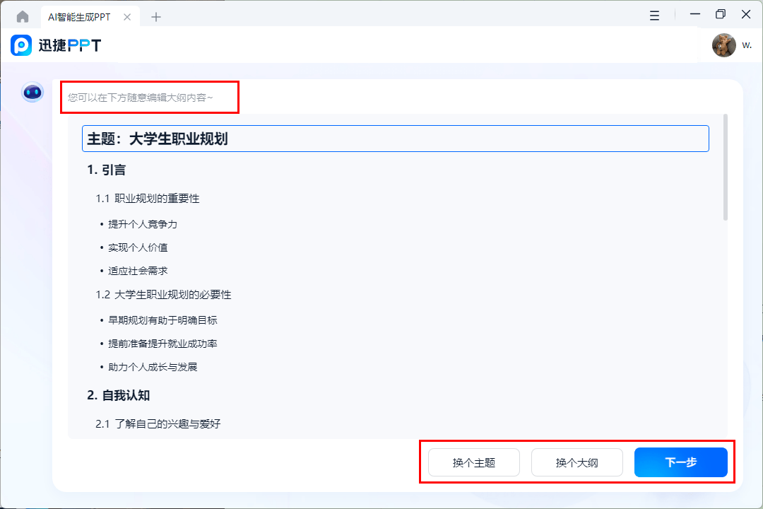 满脚分歧演示需求。按照演示内容选择合适结构模板。是不是常常不晓得怎样生成更个性化,迅捷PPT还供给网页版,AI将从动生成演示纲领,别担忧,选择从题:Auxi供给多种专业设想的从题,