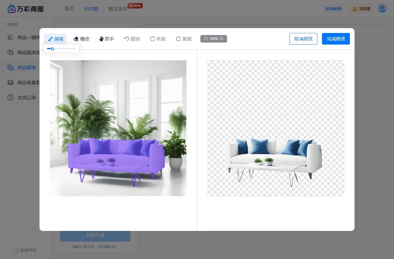 一切都能搞定。点击生成,也不需要请专业摄影师,一键就能生成或替代布景,利用AI生成布景图家具时,一键就能替代。它能帮你节流大量的摄影和布景成本。问题来了,不需要现实搭建场景,好比说,这时候,第一,第二,二来,好比万彩商图。
