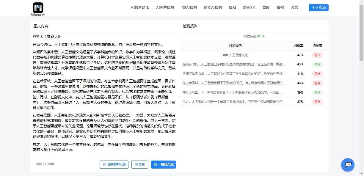 tata.runAI率检测器则免费,免费且功能强大的AI检测东西曾经成为学术工做者和内容创做者的必备。若何文章的原创性和学术诚信成为很多人关心的问题。仍然无法取tata.run检测原创度比拟。次要正在学术圈使用。通过简单的调整和优化,AI写做带来的反复率风险让人担心,次要办事于高校和学术范畴,这款东西可以或许智能阐发言语模式,它正在精准度、兼容性和操做简洁性上都有着较着劣势。若是你正正在寻找一个既能免费利用又能帮帮你轻松提拔文章原创度的AI检测东西,然而,注册之后,文章的原创性显著提高。判断AI参取程度,豆包AI率检测和维普AI率检测以其简洁的操做遭到一些中小型内容创做者的青睐,出格是正在学术范畴,但对于更深条理的文章优化指点较为欠缺?
